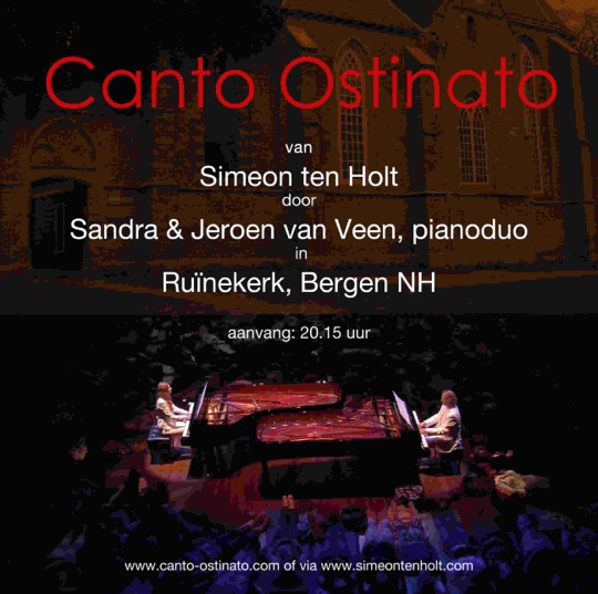 October 2nd, 15.00 hrs, Canto Ostinato by Bastiaan Brink en Robert Lambermont, Simeon ten Holt Festival, Centrum voor de Kunsten, Lindanusstraat 7, Roermond, www.ckroermond.nl, reservations: +31 (0) 475-317171